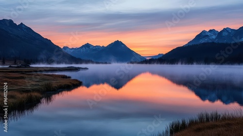Fototapeta premium Photograph a quiet nature retreat at sunrise, as fog rolls across a glacial...