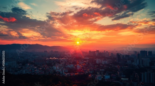 Naklejka premium Photograph a sunset over a city, with the sky ablaze in shades of orange and pink.