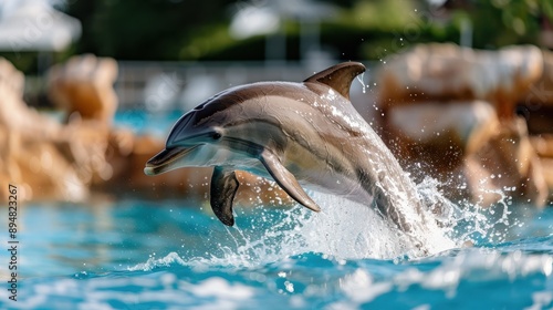 © Pinklife, Fototapeta premium Photograph captures a dynamic dolphin just above the water's surface amid a splash of blue waves, emphasizing its energetic and spirited nature within an aquatic locale.