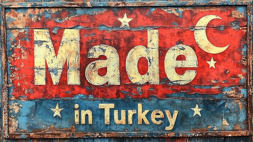 Fototapeta premium Photograph captures a weathered, rustic wooden sign prominently featuring 'Made in Turkey' text along with elements of the Turkish flag in a vintage style.