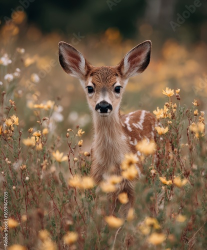 © Pixel Palette, Fototapeta premium photograph, cute baby deer in a spring wild flowers field, looking to the camera