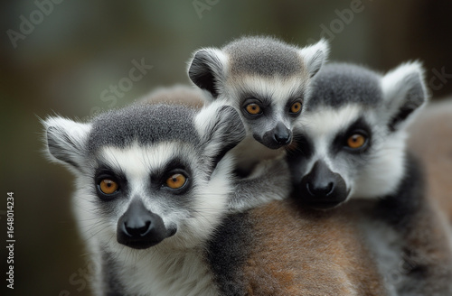 © mehroo, Fototapeta premium Photograph of a close-up portrait of three ring-tailed lemurs with a baby on the back in their natural habitat,