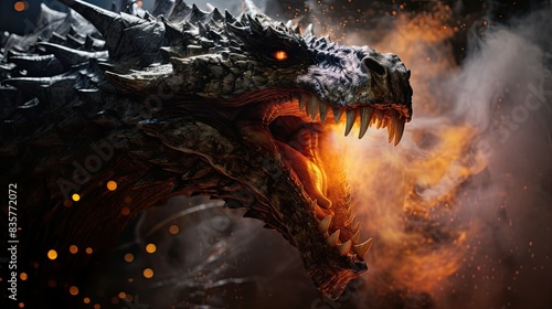 © Varunee, Naklejka premium Photograph of a dragon breathing fire in a watercolor style, creating a soft, dreamlike image of the mythical creature