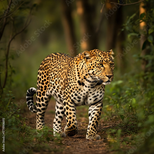 © Anisa, Obraz premium photograph of a leopard walking through the jungle