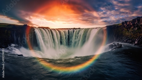 Fototapeta premium photograph of a rainbow forming a perfect circle around a majestic waterfall,...