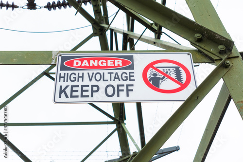 © Wittke Photography, Obraz premium Photograph of a safety sign a large steel electrical transmission tower