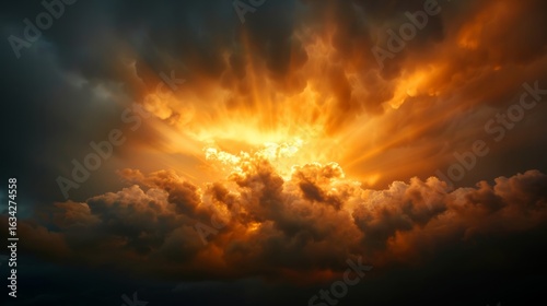 © Sirichat. Camphol, Fototapeta premium photograph of Golden Light Explosion in Dramatic Sky wide angle lens