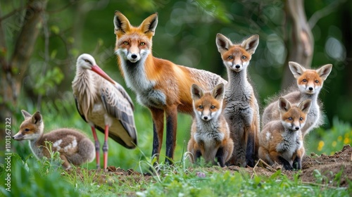 Naklejka premium photograph of Group of many animals from european fauna park and garden, red fox, stork