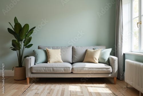 Fototapeta premium Photograph of Oversized Sofa Squeezed into a Tight Space, Overwhelming the Room and Highlighting Design Flaw