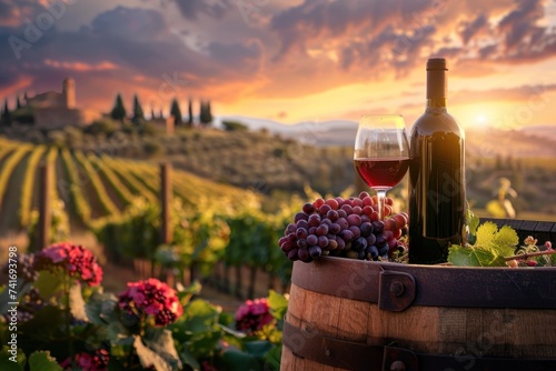 © chutikan, Fototapeta premium photograph of Red wine bottle, wine glass and wooden barrels. Beautiful Tuscany Italian vineyard background
