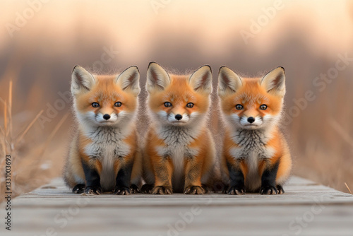 Obraz premium photograph of two fox cubs sitting on the boardwalk in a beau