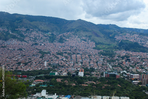 © Pablo, Naklejka premium photograph taken of the city of Medellin from one of its hills with a view towards its high and low-income neighborhoods. city in the middle of a valley and surrounded by mountains, and in the backgro