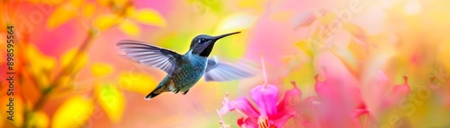 © Sukifli Dakheng, Naklejka premium Photographer capturing hummingbirds, vibrant flowers, focus on speed and color