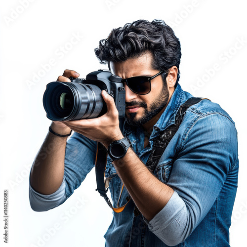 Obraz premium Photographer capturing moments with a professional camera wearing stylish...