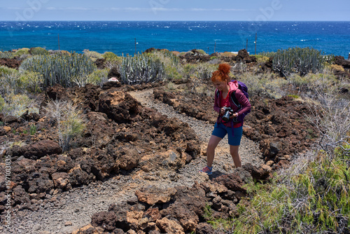 © Xalanx, Fototapeta premium Photographer hiking through volcanic terrain
