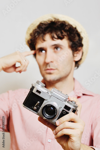 Fototapeta premium photographer holding a camera and think over the composition fra