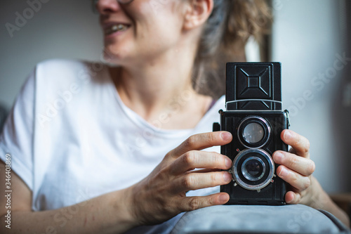 Fototapeta premium Photographer prepares her vintage analog medium format camera.