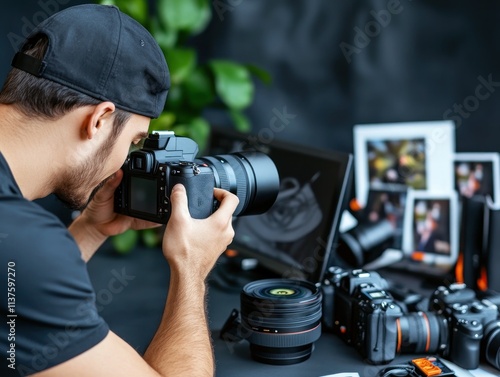 © Gendowor, Obraz premium Photographer reviewing photos on laptop, surrounded by camera equipment.