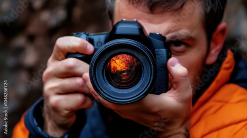 Obraz premium Photographer's Focus: A man's intense gaze through his camera lens,...