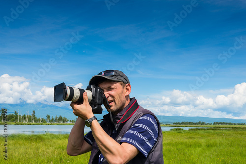 © tashas, Obraz premium photographer takes pictures of summer, mountains in the background