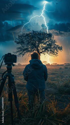 © mardoz, Obraz premium Photographer taking a picture of a tree being hit by a lightning