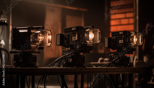 Fototapeta premium Photographer uses equipment to capture performance in studio with lighting generated by AI