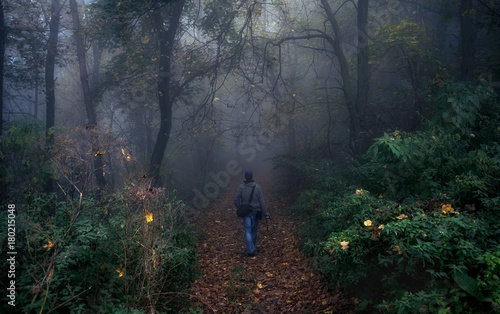 © SasaStock, Fototapeta premium Photographer walking on the path in forest