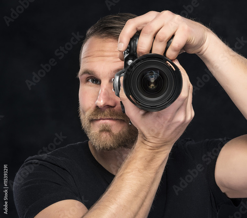 Fototapeta premium Photographer with camera on black.