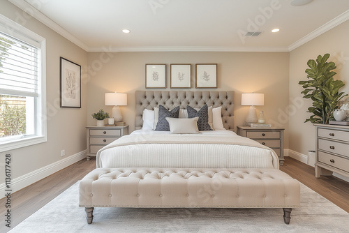 © JulieMeneghin, Fototapeta premium Photographie immobilière d'une chambre d'invités contemporaine élégante et confortable avec lit queen-size
