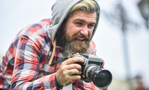 © be free, Obraz premium Photography business. Old technology. Bearded man hipster take photo. Brutal stylish man with retro camera. Modern business. Journalist reporter. Professional photographer use vintage camera