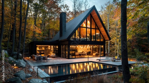 © Veayo, Obraz premium photography for interior magazine, architecture photgraph, realisitc, wide angle shot of an a frame house in new england in autumn, woods, bay, lights, pool, string lights