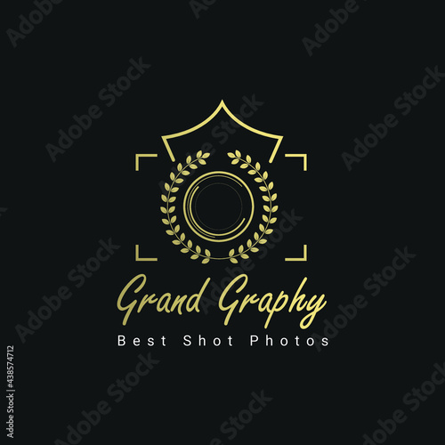 © designstack, Naklejka premium photography logo design with a camera and caesar crown leaves