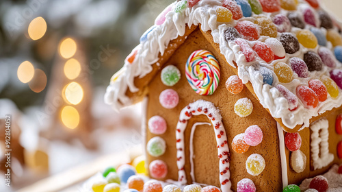 Naklejka premium Photography of a close-up of a beautifully decorated gingerbread house with...