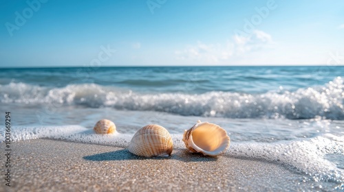© Chatchanan, Obraz premium Photography of a quiet beach with a few scattered seashells, soft waves, and a backdrop