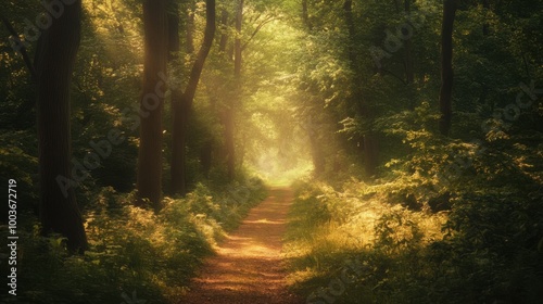 © Chatchanan, Obraz premium Photography of a tranquil forest scene with towering trees and a soft, sunlit path cutting