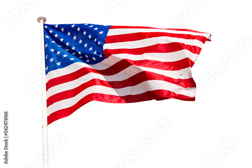 © Delphotostock, Fototapeta premium Photography of an American US flag on a pole isolated on transparent or white background, July 4, Memorial day, Veterans day, cut out png file