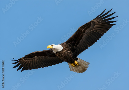 Fototapeta premium Photorealistic bald eagle soaring with wings spread wide against clear blue sky, sharp feathers and intense gaze, majestic wildlife flight