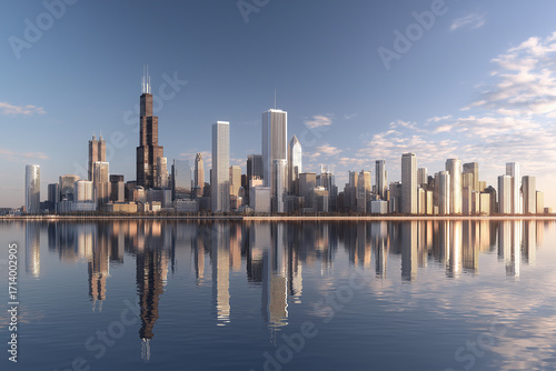 Fototapeta premium Photorealistic city skyline with skyscrapers and reflections on calm water
