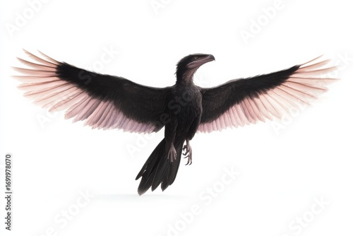 Fototapeta premium Photorealistic depiction of prehistoric feathered dinosaur in flight