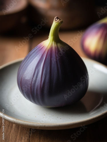 Fototapeta premium Photorealistic Fig with Deep Purple Skin and Green Stem on Ceramic Plate,...