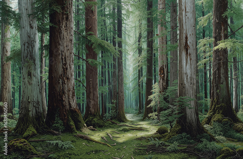 Obraz premium Photorealistic forest grove with towering trees and lush green moss covering serene woodland floor