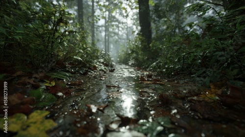 Obraz premium Photorealistic Forest Path After Rain with Wet Leaves and Reflections