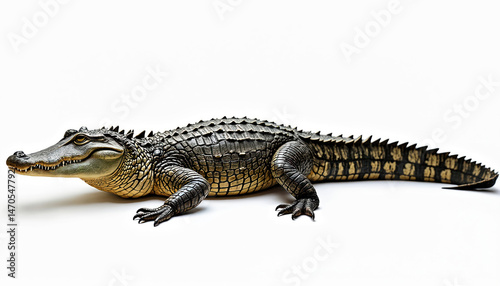 © miss irine, Naklejka premium Photorealistic illustration American alligator Alligator mississippiensis. Full body view. Dangerous predator reptile with camouflaged scales. Aquatic creature from swamp wetland nature. Isolated on