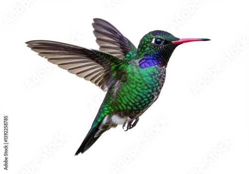 © Sejjil, Obraz premium Photorealistic iridescent hummingbird with vibrant green and blue feathers in flight on white background