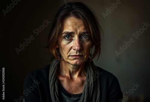 © iushakovsky, Fototapeta premium Photorealistic portrait of a poor female in a dimly lit room