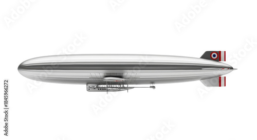© Alexander, Fototapeta premium photorealistic scale model of a highly detailed, metallic silver historic zeppelin in perfect side profile view, isolated against a transparent studio background with soft shadows. concept of vintage