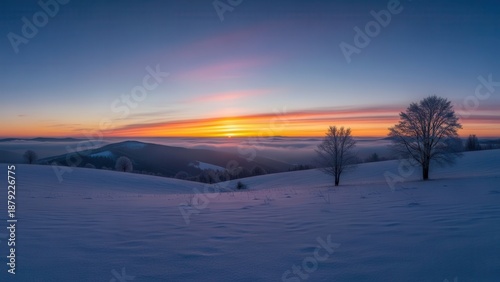 © Designer , Obraz premium Photorealistic winter solstice background, distant horizon with sun just above snow line, minimal composition