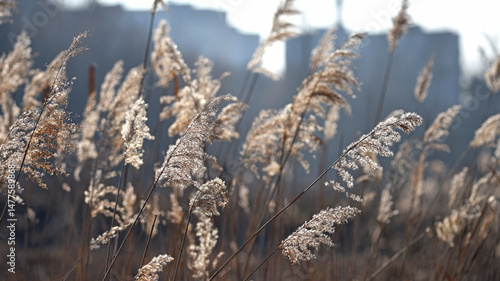 © Oleksandr Filatov, Fototapeta premium Phragmites. autumn reeds. Golden, dry winter sedge phragmites australis in selective focus. Thickets of fluffy, dry trunks. genus of reed grasses found in wetlands. nature background close up