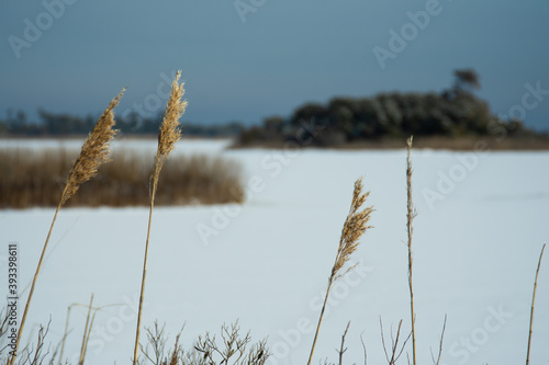© DanaDaglePhotography, Fototapeta premium Phragmites with snow covered marsh in background