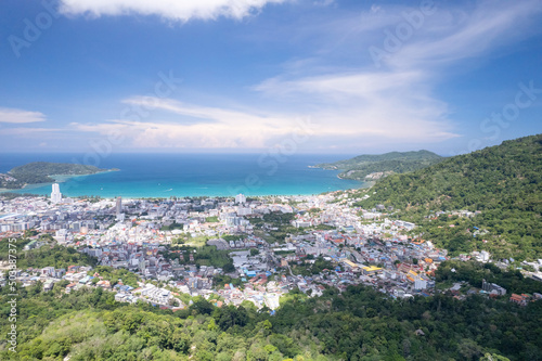 © Panya, Fototapeta premium Phuket Thailand patong bay. Panorama landscape nature view from Drone camera. Aerial view of patong city in phuket thailand. Beautiful sea in summer sunny day time